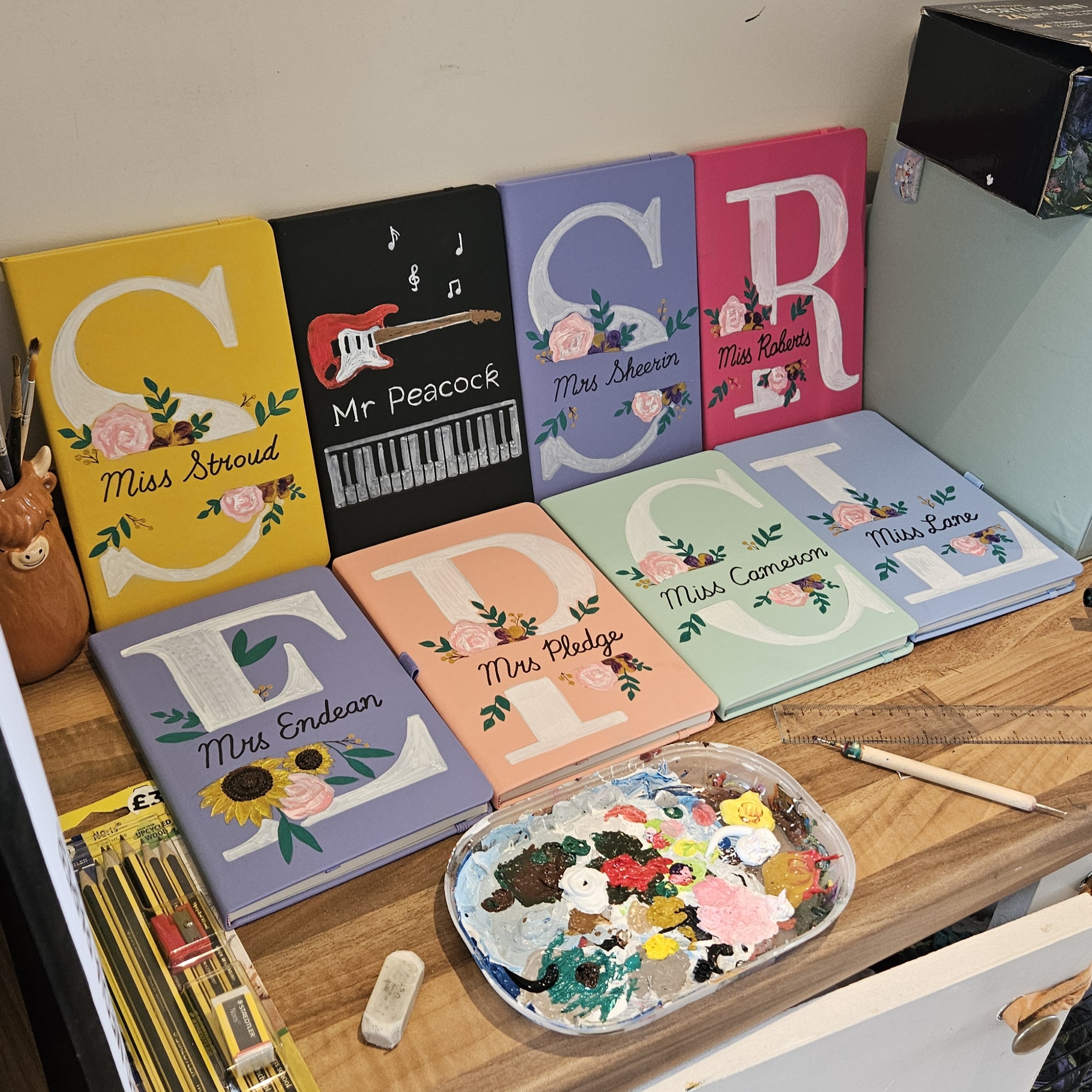 End of year teacher notebooks I recently finished a small batch of 9 custom painted notebooks — I love making these notebooks as I feel they bring together everything I love within my art: personalisation, colour, and the small details. When I first started making these it was a little…